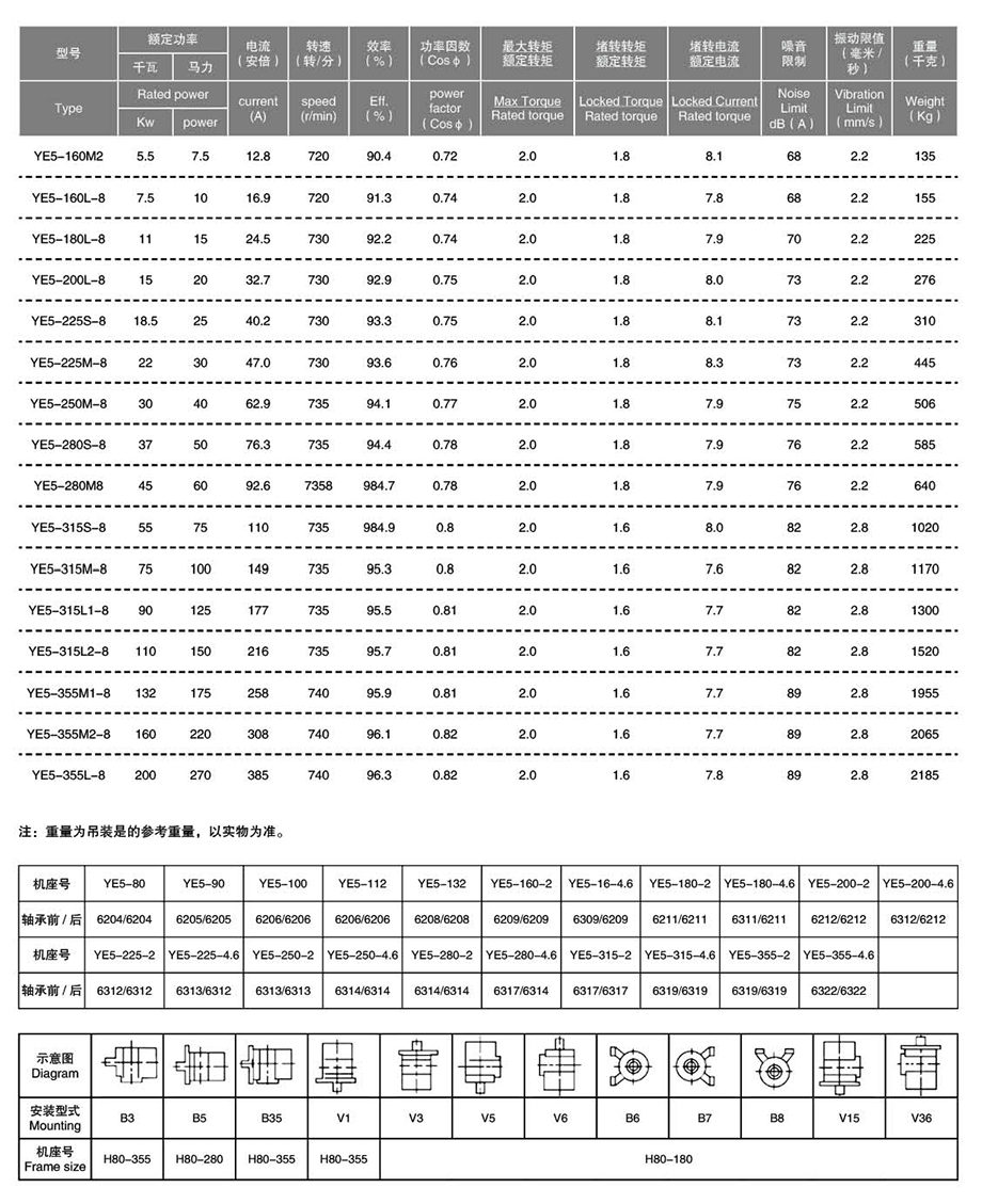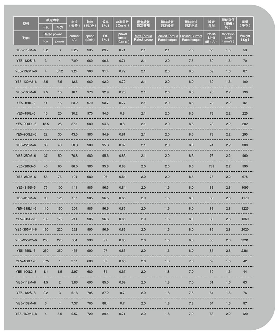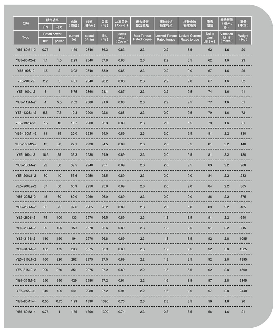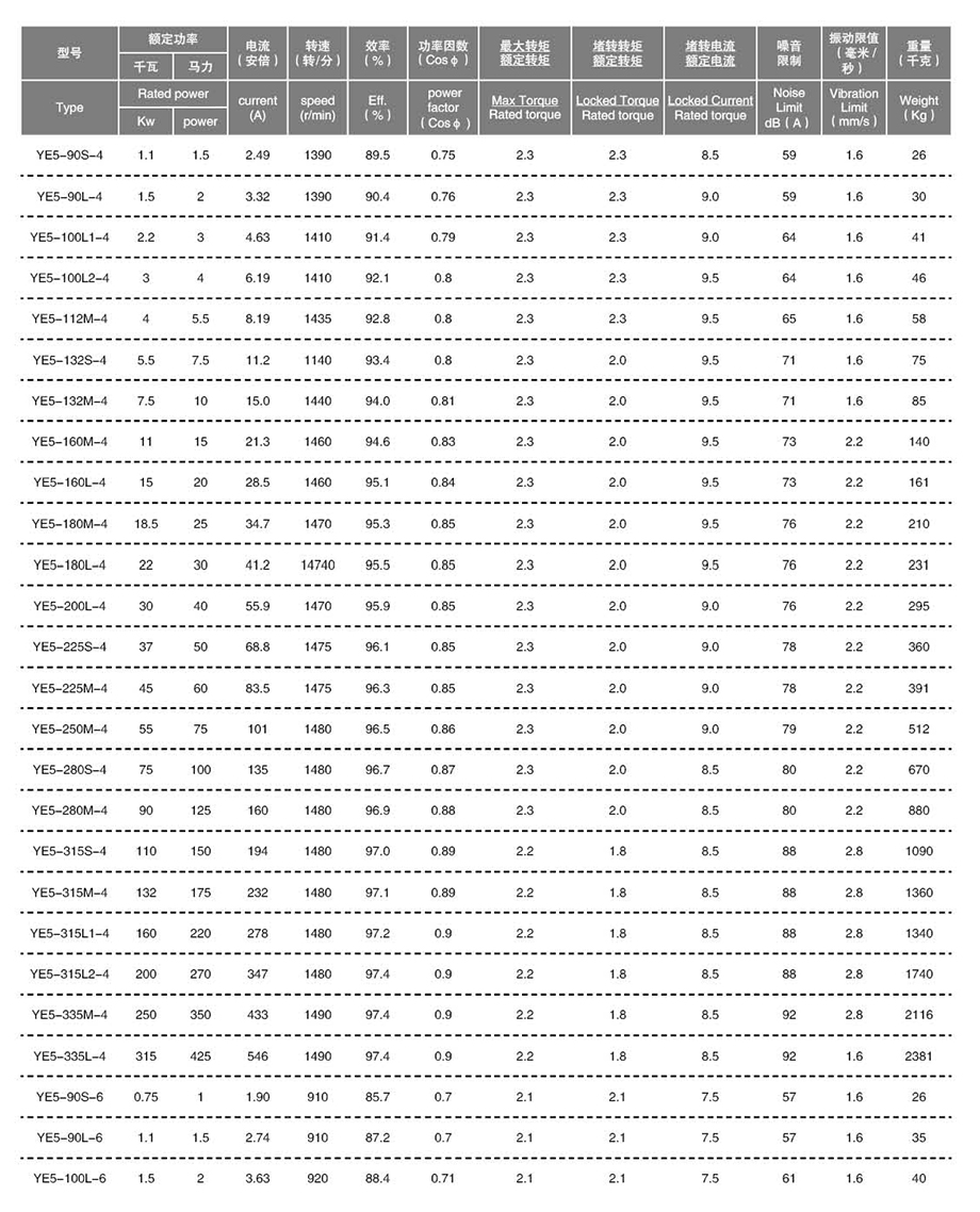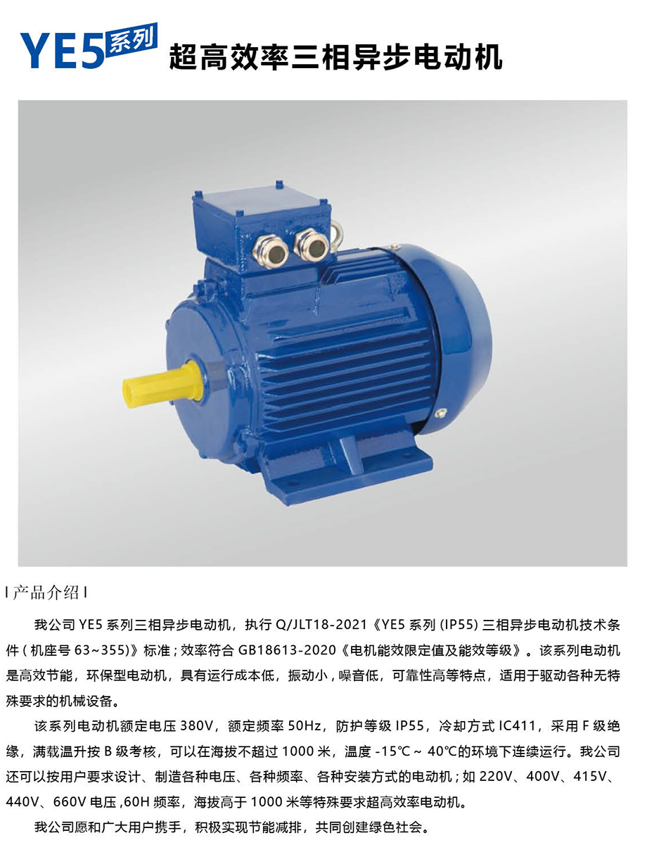 我公司 YE5 系列三相異步電動機,執行Q/JLT18-2021《YE5 系列(IP55)三相異步電動機技術條件(機座號63~355)》標準;效率符合 GB18613-2020《電機能效限定值及能效等級》。該系列電動機